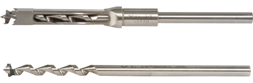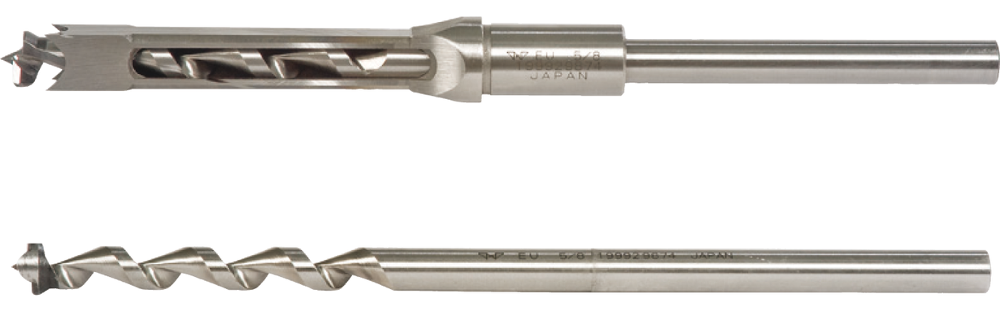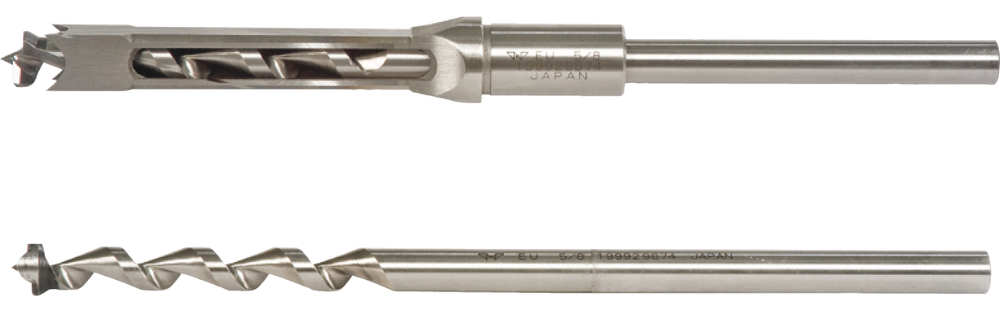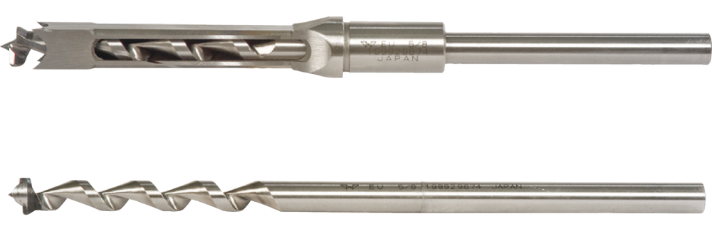 Простота и точность установки сверла-долота обеспечивается комплектом переходных втулок - достаточно выбрать нужную и зажать внешнюю часть винтом, предварительно сориентировав плоскость по упору заготовки. Для фиксации сверла предусмотрен трехкулачковый патрон с удлиненным ключом.