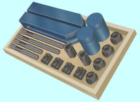 Комплект прихватов М-10 TRIOD, артикул: 574210, для фиксации заготовок, деталей сложной формы при дальнейшей обработке на фрезерных, сверлильных и других станках, имеющих ширину паза 11.7-12 мм на столе. Для удобства работы набор располагается на открытой подставке.