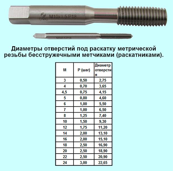 Раскатка бесстружечными метчиками (раскатниками) - холодная формовка. Применяется для получения (с высокой производительностью) резьбы в пластичных материалах таких, как алюминий, медь, сталь Ст2, Ст3 и в специальных марках сталей для холодной штамповки. Формирование резьбы путём деформации может производиться как с использованием смазки и СОЖ так и всухую (только метчиками с покрытиями). ГОСТ18839-73 ГОСТ18843-73 ГОСТ18842-73 ГОСТ18844-73