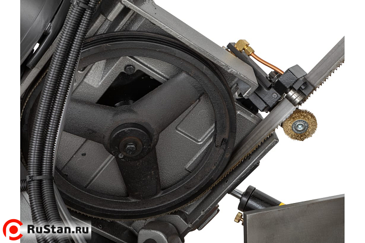 Моторная группа состоит из мощного электродвигателя - 1,1 кВт, обеспечивающего стабильную работу ленточного станка в различных скоростных режимах. Ременная передача позволяет осуществлять пиление заготовок на скоростях движения ленточного полотна в 26, 50, 73 и 95 м/мин. Управление работой станка осуществляется с пульта управления, установленного на консоли. Оборудование оснащено кнопкой аварийной остановки.