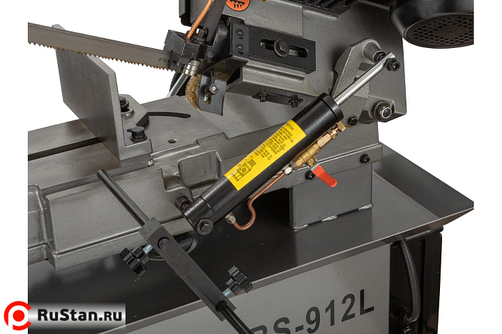 Процесс установки заготовок под нужным углом осуществляется за счет имеющихся механических тисков, оборудованных поворотными губками. Подъем и опускание тяжелой пильной рамы осуществляется за счет функционирования системы гидроразгрузки. С помощью гидроцилиндра можно осуществить регулировку скорости опускания консоли. Необходимое прижимное усилие рамы на обрабатываемую заготовку осуществляется за счет веса консоли.