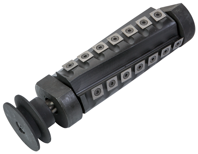 В штатный комплект поставки входит ножевой барабан с тремя прямыми лезвиями, за дополнительную плату можно приобрести вал helical с твердосплавными режущими сегментами, расположенными в несколько рядов по спирали. Каждое лезвие имеет четыре режущих кромки, что кратно увеличивает его ресурс. Станки с helical имеют ряд общих достоинств: отличное качество строгания, в том числе свелеватой древесины, отсутствие ударных нагрузок при работе и характерной дробной структуры на проструганной поверхности, низкий уровень шума, небольшой размер отходящей стружки (упрощает аспирацию отходов), высокий ресурс ножей и, соответственно, продолжительные межсервисные интервалы.