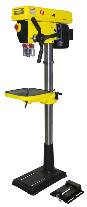 Для установки ограничителя глубины сверления предусмотрена поворотная муфта с миллиметровой разметкой и фиксатором. Частоту вращения сверла меняют переустановкой ремня между парой ступенчатых шкивов. Станок комплектуется удобным быстрозажимным патроном, станочными тисками и лазерным указателем места сверления.